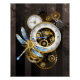 Antiquitätendiale mit Gold- und Messinggetrieben, mit mechanischer Libelle auf braunem, gestreiftem Hintergrund dekoriert. Steampunk.