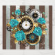 Gemusterte, antike Uhr mit Schmuck, goldene Stunden und lateinische Zahlen mit türkisfarbenen Rose auf braunem, gestreiften Hintergrund. Steampunkstil.