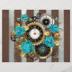 Gemusterte, antike Uhr mit Schmuck, goldene Stunden und lateinische Zahlen mit türkisfarbenen Rose auf braunem, gestreiften Hintergrund. Steampunkstil.