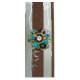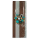 Gemusterte, antike Uhr mit Schmuck, goldene Stunden und lateinische Zahlen mit türkisfarbenen Rose auf braunem, gestreiften Hintergrund. Steampunkstil.