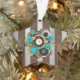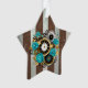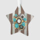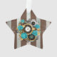 Gemusterte, antike Uhr mit Schmuck, goldene Stunden und lateinische Zahlen mit türkisfarbenen Rose auf braunem, gestreiften Hintergrund. Steampunkstil.