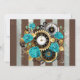 Gemusterte, antike Uhr mit Schmuck, goldene Stunden und lateinische Zahlen mit türkisfarbenen Rose auf braunem, gestreiften Hintergrund. Steampunkstil.