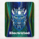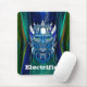 Futuristisch aussehendes Mousepad, mit grafischem Kunstwerk eines metallischen, blauen Roboterkopfes mit elektrischen Strömungen, die von ihm nach oben und unten gehen. Benutzerdefinierter Text am unteren Rand ist bereit, zu personalisieren, um zu lesen, was Sie gewollt.