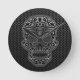 Dieses symmetrische Design des Zuckerschädels ist mit aufwändig hellgrünen Wirbel und Punktmustern dekoriert. Die Schädelaugen bestehen aus zwei kreisförmigen Blume und in der Stirn befindet sich ein Fünf-Punkte-Stern. Ein Schatten fällt auf den Hintergrund der Stahlgitter und verleiht dem Muster ein industrielles Aussehen. Dieser stilistische Zuckerschädel ist eine einzigartige Interpretation dieses Tages des Toten Symbols.