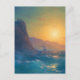 Two horse riders on a steep rocky coast, watching a ship sailing the waves of a rough sea at sunset. A beautiful piece of art with really astonishing colors and light effects. Oil on canvas by painter Ivan Aivazovsky.