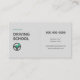 A simple business card for driving school activities featuring a steering wheel icon with a green check symbol. It could also be employed for various purposes, including auto sales, taxi driving, transportation, auto repair, and car washing.