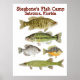 Poster für Stegbone's Fish Camp mit Bildern von original Aquarellen von Thom Glace von einem Smallmoth und Largemouth Bass, Black Crappie, Bluegill und Chain Pickerel.