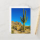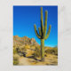 Das Foto zeigt einen großen, multibewaffneten Saguaro-Kakteen durch einen Wanderweg, der zu einem boulderbewachsenen Berg in der Sonoran-Wüste führt.