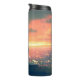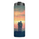 stehendes junges Paar auf dem Dach mit Blick auf c Thermosbecher