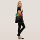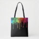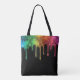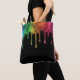 Shiny blue, green yellow and purple nail polish spills are on the front and back of this tote bag.
