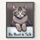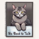 Journal in einer Illustration einer streng aussehenden grauen Tabbattkatze mit durchstechenden gelben Augen, die ihre Vorderpfoten auf einer Spitze ruhen und direkt nach vorn schauen, mit einer Luft von ernsthafter Autorität. Unter der Katze steht kühne Schrift: "Wir müssen reden" und fügt Spaß und Drama hinzu.