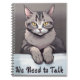 Notebook in einer Abbildung einer streng aussehenden grauen Tabbattenkatze mit durchstechenden gelben Augen, die ihre Vorderpfoten auf einem Kamm ruhen und direkt nach vorn schauen, mit einer Luft von ernsthafter Autorität. Unter der Katze steht kühne Schrift: "Wir müssen reden" und fügt Spaß und Drama hinzu.