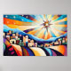 Dieses lebendige Bild des Sterns von Bethlehem erfasst das Wunder und die Schönheit der ersten Weihnachtsnachtsnacht. Der Stern strahlt in kühnen, frischen Farben und strahlendem Licht über ein stilisiertes Stadtbild und leuchtet hell über den Hügeln von Bethlehem und führt so den Weg zum neugeborenen König. Die reichhaltigen Texturen und die fröhliche Palette machen dieses Stück zeitlos und lebendig.