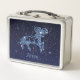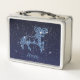 Mittagsschachtel mit dem Symbol für Sterne in weichem silberblauem Blau, überlagert mit den Sternen des Sternenhimmels, vor einem Sternenhimmel, der von tiefer Mitternacht blau bis schwarz gestuft wird.