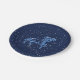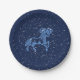 Papierplatte mit dem Symbol für Äries in weichem silberblauem Blau, überlagert mit den Sternen des Sternbildes, vor einem Sternenhimmel in tiefblauem Mitternachtsblau