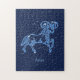 Puzzle mit dem Zodiaksymbol für Sterne in weichem silberblauem Weiß, überlagert mit den Sternen der Sterne, vor einem Sternenhimmel, der von tiefer Mitternacht blau bis schwarz gestuft wird.