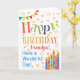 Eine farbenfrohe, textbasierte Geburtstagskarte für einen Großvater, mit Polka Dot Bunting, hellen, gestreiften Geburtstagskuchen und vergoldeten Sternen. Der gemusterte Text sagt: "Happy Birthday" und es gibt auch "Habe einen wunderbaren Tag!" in blauer Schrift (NB die goldenen Effekt-Sterne und Konturen werden so gesehen und nicht in metallischer Tinte gedruckt).