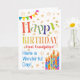 Eine farbenfrohe, textbasierte Geburtstagskarte für einen Großvater, mit Polka Dot Bunting, hellen, gestreiften Geburtstagskuchen und vergoldeten Sternen. Der gemusterte Text sagt: "Happy Birthday" und es gibt auch "Habe einen wunderbaren Tag!" in blauer Schrift (NB die goldenen Effekt-Sterne und Konturen werden so gesehen und nicht in metallischer Tinte gedruckt).
