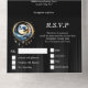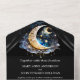 Eine wunderschöne Alleinerzeit-Mondeinladung mit Halbmonden und Vollmonden, die durch leuchtend blaue und goldene, funkelnde Sterne-Sets vor einem schwarzen Hintergrund von Mitternacht, der in eine beliebige Farbe geändert werden kann, dreidimensional gerahmt zu sein scheinen. Diese generativen Inhaltsgrafiken sind ideal für eine Sternennacht, über den Mond, den Segelmond, eine Galaxie oder ein himmlisches Thema Hochzeit oder besondere Veranstaltung. Im unteren Drittel befindet sich eine Antwortkarte mit personalisierter uAwg, die Sie abschließen können.