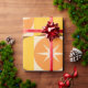 Das ist ein elegantes atomares Sternexplosionen-Muster aus der Mitte des Jahrhunderts auf orangefarbenen Kreisen und gelben Halbkreisen auf Quadraten. Es ist großartig aussehendes Packpapier für Party und Anlässe