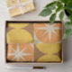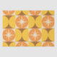 Das ist ein elegantes atomares Sternexplosionen-Muster aus der Mitte des Jahrhunderts auf orangefarbenen Kreisen und gelben Halbkreisen auf Quadraten. Es ist großartig aussehendes Gewebepapier für Party und Anlässe