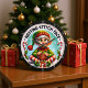 Dies ist ein spielerisches, kreisförmig-gerahmtes Grafikdesign mit einem humorvollen Strick- und Weihnachtsthema. Das zentrale Bild zeigt eine Karikatur eines Weihnachtselfs mit einem gruseligen oder "ruhenden Stich Gesicht" Ausdruck. Der Elf trägt einen grünen Hut mit rotem Pom und hält eine große Kugel roter Garne und Stricknadeln. Der Elf sitzt auf einem umhüllten Geschenk und wird von Bonbons und Heiligen flankiert. Der Satz "RESTING STITCH FACE" ist oben im runden Rahmen. Der Hintergrund ist hellblau mit weißen Schneeflocken.