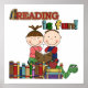 A stick figurboy and girl, books, a book worm, and text that reads "Reading is fun!" wir reading theme T-shirts, mugs, cards, stickers, tote Bags, Keychains, Buttons, Magnets, Ornaments und other items great for anyone loves reading and books!