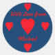 Ein großes rotes Herz in der Mitte, vier kleinere auf der links und rechten Seite und auf der Oberseite und am Ende des Aufklebers, mit den Worten "Mit Liebe von Michael" zwischen ihnen geschrieben. Sie können einfach Ihre Wörter und den Namen Ihrer Wahl einfügen und die Farbe des Hintergrunds ändern. Dies ist der perfekte Geschenksticker für Ihre Valentinstag Geschenke!