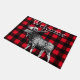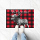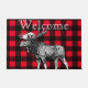 Kariertes Muster des mutigen Büffel-Karos in Rotem und in Schwarzem mit einer ausführlichen Schwarzweiss-Elchillustration und dem Wort "Willkommen" in einem weißen offenen Gesichts-Schriftart in der Spitzenmitte. Diese Fußmatte ist für eine Kabine oder einen Camper groß!