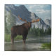Ein Stierelch steht im tiefen Wasser des Knöchels von einem flachen, faulen Fluss, der seine Weise durch ein bewaldetes Tal wickelt. Tannenbäume und langes Gras zeichnen die Banken der Flüsse, während gezackte felsige Berge das Tal einschließen. Der Elch betrachtet zurück Ihnen, als ob Sie ihn gerade unterbrochen haben, während er etwas trinkt.