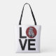 Stier-HundeLiebe-Taschen-Tasche - weißer englischer Stierhund mit rotem und schwarzem Hintergrund im Kreis des O in der LIEBE. Zeigen Sie Ihre LIEBE Ihres Stier-Hundes! Kunst durch Barbara-Eile