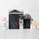 Nahtloses Muster aus stilisierten blauen Füchsen mit aufwendigen floralen Designs auf schwarzem Hintergrund. Rote Akzente und weiße Blumen erzeugen eine fantasievolle, mystische Atmosphäre.
