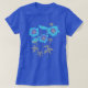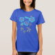 Grafisch blaue, lila und graue Blumenmohnchen dekorative Damen T - Shirt. Basierend auf dem zerrissenen Mohn, der mit dem isländischen Blau überquert wurde. Kunst und Design von Sarah Trett.