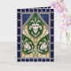 Wünschen Sie Familie und Freunden ein "glückliches Ostern" mit dieser hübschen, etwas weniger offen religiösen Karte, die Farbglas in reicher dunkler Blues simuliert, Grüntöne mit leuchtenden Frühlingspunkten, weiche, warme Gelbtöne und Silbergraue. Im Liberty-Stil, der britischen Version des Jugendstils, wird die Karte innen und außen mit großen Paneelen gezeichnet, die stilisierte Osterlililien darstellen. + Image Credit (RT 01): Antike Bilder aus einer geprägten Postkarte in Chromolithografie mit dem Titel A Friedlich Oaster, Oaster Hymns Series, Nr. 714, ursprünglich von Raphael Tuck & Sons, London, England herausgegeben und 1912 in Sachsen, Deutschland, aus der Privatsammlung des Designers gedruckt.