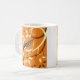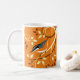 Dekorative Rot-Brust-Nuthatch-Tasse mit orangefarbenem Hintergrund und Blattmuster um Wirbel