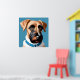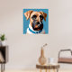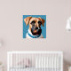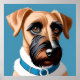 Illustriertes Porträt eines Terrier Hundes mit ausdrucksvollen Augen, mit einem blauen Kragen vor einem lebendigen Hintergrund. Der moderne Kunststil verbindet Realismus und Kreativität und hebt die einzigartigen Merkmale des Tieres hervor.