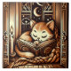 Die Kunst-Deko-Kunststil-Illustration einer Katze, die auf einem Buch mit Kerzenlicht schläft, vor einem Fenster mit einem Nachthimmel mit Mond und Sternen draußen. Die Farben sind braune Sepia-Töne.