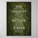 "Gott gewähre mir die SERENITÄT, Dinge zu akzeptieren, die ich nicht ändern kann; den Mut, die Dinge zu ändern, die ich kann; und den WISDOM, den Unterschied zu wissen." Frieden, Kraft, Heilung und Verständnis in einer Zeit der Turbulenzen, Verzweiflung oder Unsicherheit. Bekannt als "Das Stille Gebet", verbunden mit Erholung und 12 Step Programmen. Verwendet von OM (Alcoholics Anonymous). Gebet geschrieben von Reinholt Niebuhr. Design: Grunge Text mit Tarnung Hintergrund. Paula Bragg 2011 Text: "Gott gibt mir die SERENITÄT, Dinge zu akzeptieren, die ich nicht ändern kann; den Mut, Dinge zu ändern, die ich kann; und den WISDOM, den Unterschied zu wissen."
