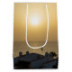 Aussicht auf die Bungalow-Anlage mit einem Segelboot bei Sonnenuntergang in Costa Adeje, Spanien, Teneriffa