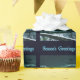 Eine Nachtszene im Norden. Die Nacht ist gefallen, und am Horizont gibt es einen Hauch von Nordlichter jenseits der Berge. Das Mondlicht reflektiert die verschneite Landschaft. Eine Eule sitzt in einem toten Fichtenbaum auf der Suche nach Volen. Text liest "Die Grüße der Jahreszeit" erscheint in blau und weiß.