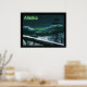 Eine Nachtszene im Norden. Die Nacht ist gefallen, und am Horizont gibt es einen Hauch von Nordlichter jenseits der Berge. Das Mondlicht reflektiert die verschneite Landschaft. Eine Eule sitzt in einem toten Fichtenbaum auf der Suche nach Volen. Der Text "Alaska" erscheint auch in grün und weiß.