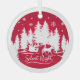 Weihnachtsglasverzierungen mit weißen Kiefern-Silhouetten mit Schneeflocken und einem Pferd gezeichnet Schlitten auf festlich rotem Hintergrund, mit dem Wortlaut Stille Nacht in weißer handgeschriebener Schrift.