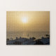 Aussicht auf die Bungalow-Anlage mit einem Segelboot bei Sonnenuntergang in Costa Adeje, Spanien, Teneriffa