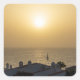 Aussicht auf die Bungalow-Anlage mit einem Segelboot bei Sonnenuntergang in Costa Adeje, Spanien, Teneriffa