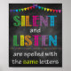 SILENT & LISTEN druckbares Plakat Ein großartiges Poster, um in einem Klassenzimmer aller Altersgruppen zu hängen, um die Kinder daran zu erinnern, dass es kein Zusammenspiel ist, dass Stille und Hören mit den gleichen Buchstaben geschrieben werden! Mit einem auffälligen Design zeichne der Schüler in den Augen, um zu gewährleisten, dass sie LESEN und sich daran erinnern SILENT und LISTEN zu sein! Ein großartiges Poster zur Dekoration des Klassenzimmers - schöne, helle Farben und ein Imitat Stil Chalkboard Hintergrund. Druckt schön!