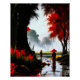 Dieses digitale Kunstwerk mit Rot Tönung zeigt einen ruhigen Moment auf dem vietnamesischen Land: Zwei Personen in traditionellen Kegelhüten und Gewändern durchqueren einen flachen Bach unter einer leuchtend roten Baumkrone. Die Szene ist ein kunstvoller Mix aus Natur und Kultur, eingebettet in einen sanften Nebel, der die kräftigen Farben mildert und dem Bild eine traumhafte Tiefe verleiht. Feurige Blätter bilden einen eindrucksvollen Kontrast zu den goldgelben und sattgrünen Feldern im Hintergrund und rahmen die Figuren in einer friedlichen Umarmung der Landschaft.