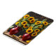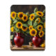 Erschaffen Sie ein bezauberndes künstlerisches Bild mit einer lebhaften Anordnung gelber Sonnenblumen, die in rustikalen roten Vasen anmutig dargestellt sind. Die Komposition sollte die Sonnenblumen zeigen, jede in verschiedenen Bühnen von Blüten, stehend groß und stolz in der Vase. Sorgfältig darauf achten, die komplizierten Details der Blütenblätter zu erfassen und ihre goldenen Farbtöne und zarten Texturen zu enthüllen.