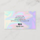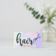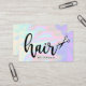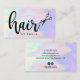 Schönes hairstylistisches Visitenkartendesign mit bunten Imitaten holografischer Textur, Schere und elegantem Kalligraphie-Schriftart.