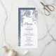 Ein stilvolles, elegantes, weißes und lila bläuliches Hochzeitmenü. Diese minimalistische pastellfarbene Sommerblumen-Hochzeitseinladung ist perfekt für jedes elegante Mädchen. Dieses Design eignet sich ideal für ein trendiges und stilvolles Hochzeitsfest. Passen Sie dieses Design mit Ihrer Nachricht und personalisierten Informationen an. Alle Designs sind gedruckt.