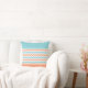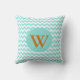 Stilvolle Kissen mit einem anderen Look auf beiden Seiten. Die Vorderseite hat ein korallenweißes und aquamarinisches Zickzack Zickzackmuster, das durch die Mitte verläuft, oben mit festem Aquamarin und unten auf dem Kissen mit solider Korallenfarbe. Die Rückseite ist in einem Aquamarin-Weiß-Zickzack Muster, mit einem großen Aquamarin-Kreis, in der Mitte, mit einer kühnen Koralle gefärbt ein Buchstaben Monogramm. Ideal für alle Zimmer des Hauses oder des Büros.